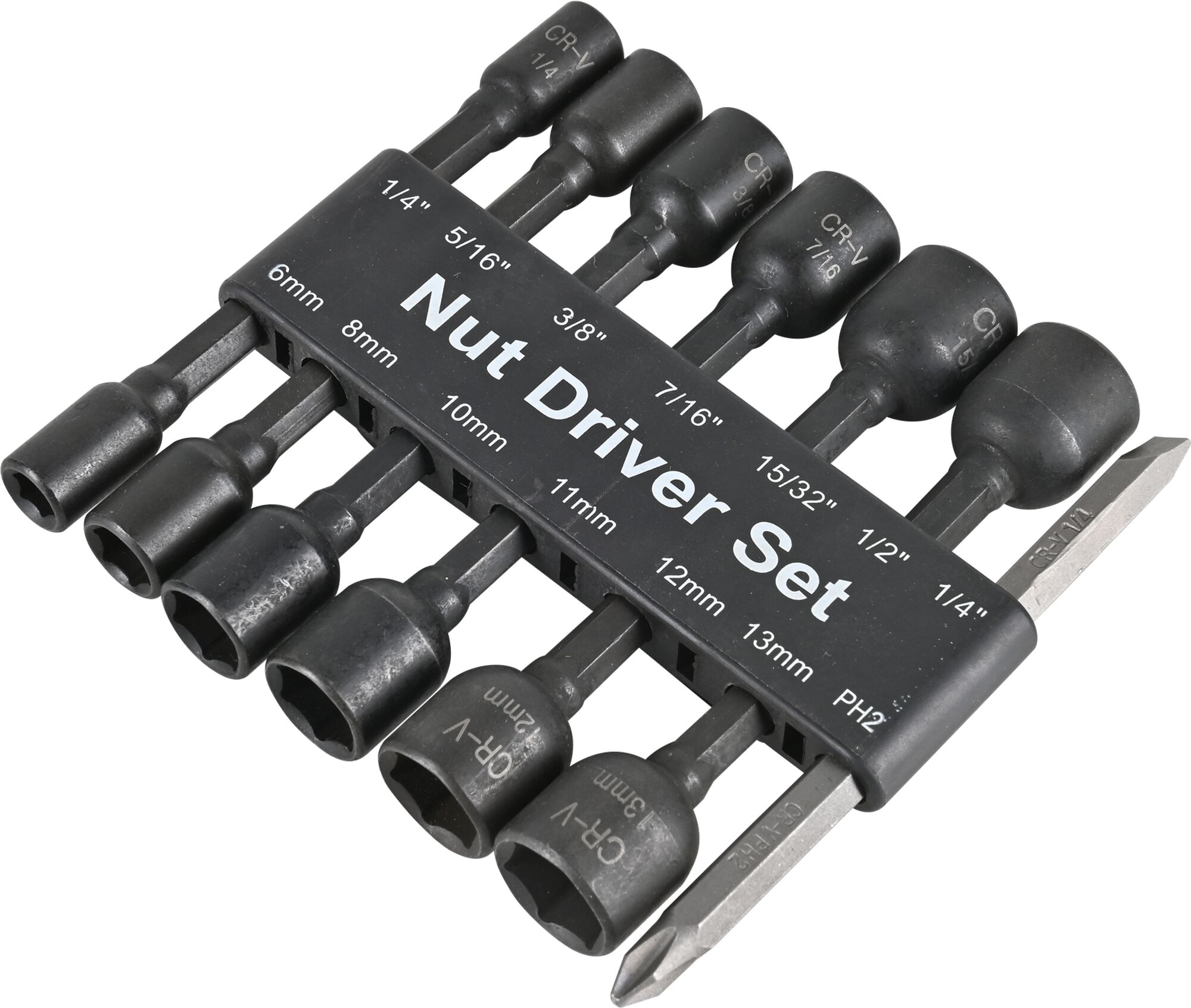 This set includes nut drivers ranging in size from 1/4 to 1/2 in. and 6 to 13 mm. They come with a holder and are made from chrome-vanadium steel with black-oxide finish.